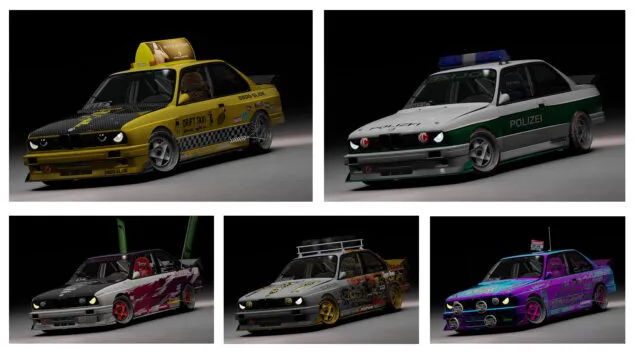 This is a replacement kit for the stock Kunos BMW M3 E30 Drift. It has most parts from the DTM version swapped like the stripped interior. It also has custom seats and steering wheel. Angry eyes, new rear spoiler, g-force lights and digital dash. It has 5 custom skins aswell